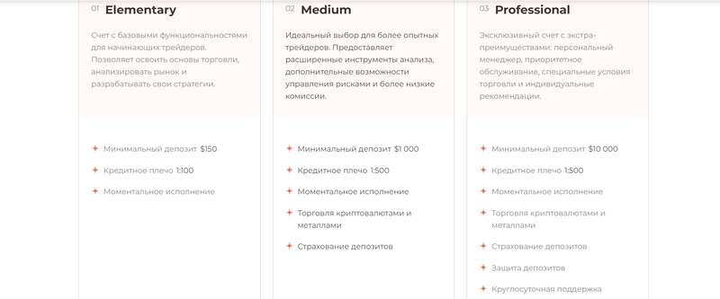 Чтобы расширить круг потенциальных участников проекта, на сайте предусмотрено три тарифных плана с разным размером стартового депозита. Демо-счет в системе не предусмотрен – такой подход позволяет мотивировать трейдеров с первого дня работы с брокером вносить реальные деньги на свой баланс. В зависимости от имеющегося бюджета, посетители сайта могут выбрать любой из доступных типов счета: